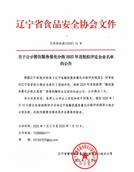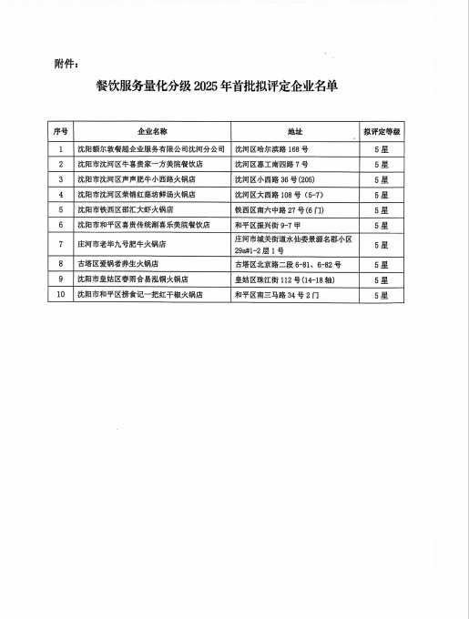 关于公示餐饮服务量化分级2025年首批拟评定企业名单的公告