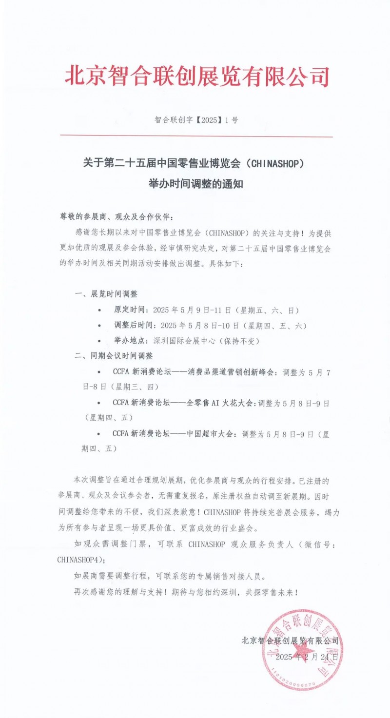 为呈现更高质量的行业盛会,经组委会慎重研究决定,原定于2025年5月9-11日在深圳国际会展中心举办的第二十五届中国零售业博览会,将调整至2025年5月8-10日举办,地点不变。