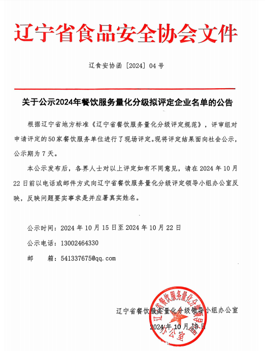 关于公示2024年餐饮服务量化分级拟评定企业名单的公告