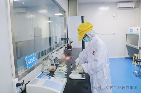 参观首站是配餐公司的化验室。这里配备了农药残留检测仪、微生物培养箱等专业设备。工作人员介绍,根据国家市场监督管理局的最新要求,企业对每批次食材都要进行“双检”,即:供应商出厂检测与自建实验室复检,重点检测农药残留、致病菌等18项指标,保证“食材制作前必须100%合格”。